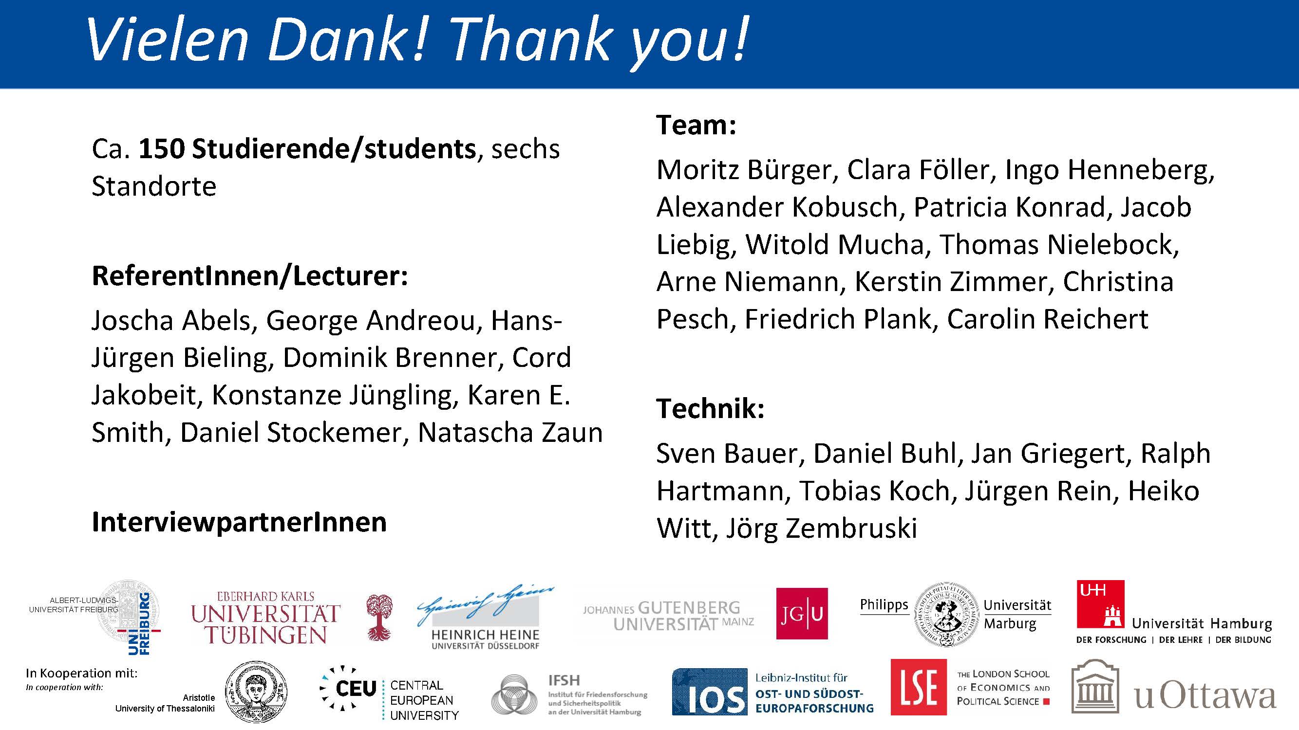 - Gefördert durch Mittel des Gutenberg Lehrkolleg Schwerpunktprojekt Internationalisierung der Politikwissenschaft: Ausbau und Verstetigung innovativer englischsprachiger Lehre