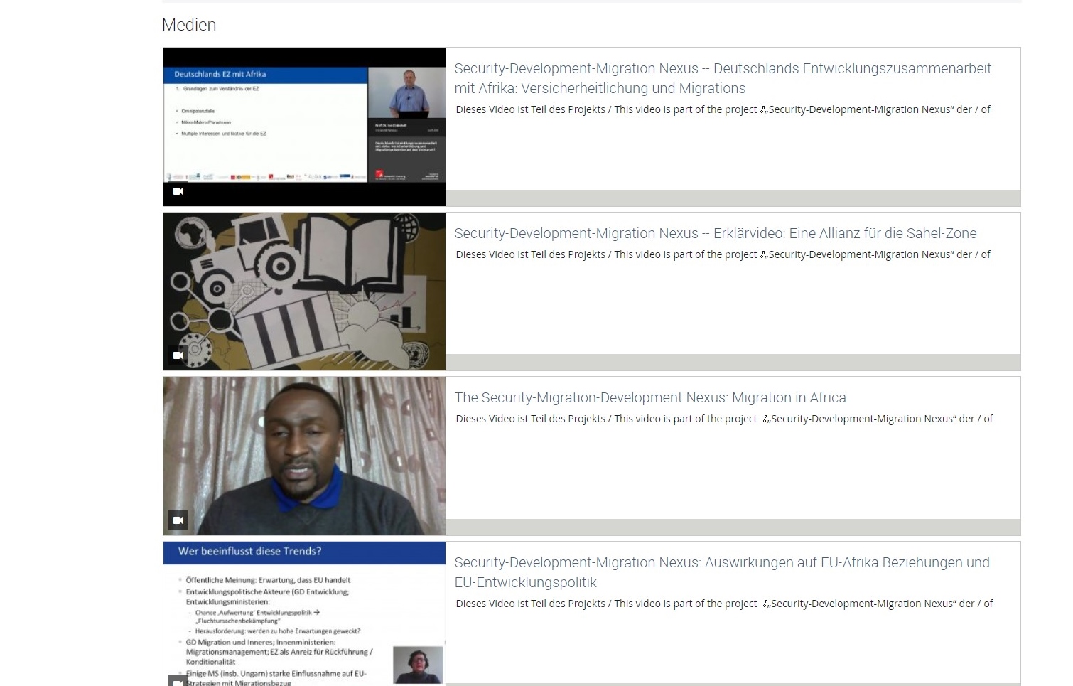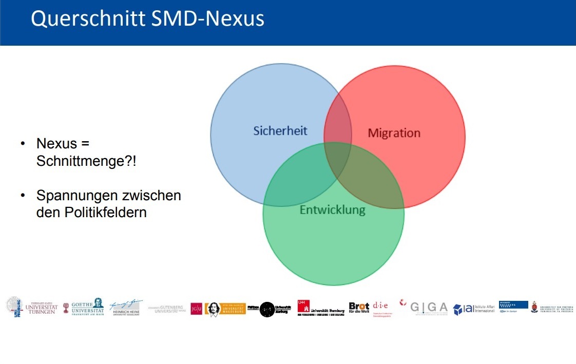 Einführung | Politikfeldanalyse I: Sicherheit und EntwicklungIn diesem Modul werden die zentralen Erkenntnisse des Zusammenhängens von Entwicklungszusammenarbeit und Sicherheit präsentiert. Versicherheitlichungstendenzen spielen insbesondere in der Entwicklungszusammenarbeit eine gewichtige Rolle und sollen hierbei rekonstruiert werden. <br> | Politikfeldanalyse II: Sicherheit und MigrationSpätestens seit der Flüchtlingskrise findet sich ein stärkerer Zusammenhang zwischen Migration und Sicherheit. So verknüpfen hochrangige PolitikerInnen Migration mit der Unsicherheit von Jobs, Bedrohung von Identität oder auch Terrorismus. Ob tatsächlich eine Versicherheitlichung von Migration stattfindet, wird im folgenden Modul mithilfe einer Analyse von zwei Reden, von Horst Seehofer und Theresa May, untersucht. | Der Security-Development-Migration Nexus in AfrikaIn diesem Modul werden die drei Politikfelder Sicherheit, Migration und Entwicklung zueinander in Beziehung gesetzt und als trilateraler Nexus behandelt. Im Zentrum steht dabei die praktische Manifestation von Versicherheitlichung, welche anhand von Fallbeispielen aus dem afrikanischen Kontext betrachtet wird. | Deutschland als Akteur im NexusIn diesem Modul geht es darum, wie der Nexus aus deutscher Sicht wahrgenommen wird und wie die deutsche Politik auf ihn reagiert. Neben der seit den 1990er Jahren bestehenden Verknüpfung von enwicklungs- und sicherheitspolitischen Fragen gewann in jüngerer Zeit der Aspekt der Migration massiv an Bedeutung. Inwiefern sich seine Wahrnehmung aufgrund von Prozessen der Versicherheitlichung verändert hat, wird im Folgenden aus verschiedenen wissenschaftlichen Perspektiven und anhand von Fallbeispielen bewertet. |